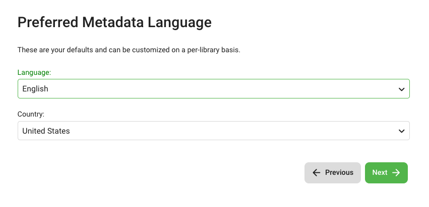 1. Select your Preferred Metadata Language and Country (English and United States are recommended) and click Next.
