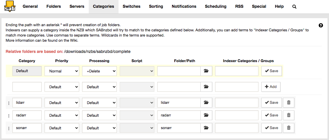 Note that the category matches between Radarr and SABnzbd. The specific category doesn't matter; just that they match.